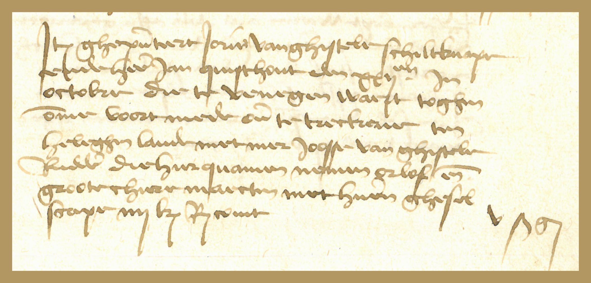 In deze stadsrekening staat vermeld, dat ze op 22 oktober 1482 bezoek kregen van een schildknaap Joosken van Ghistele en Jan van Quisthout die, zo staat er letterlijk: ‘naar Venetiën trokken om mede over te trekken naar het Heilige Land met Ruddere Mher Joos van Ghistele en die in Hulst oorlof (afscheid) kwamen nemen en er grote sier maakten met hueren ghesel-scape’. Nu weten we dat Jan van Quisthout samen met Mher Joos is vertrokken uit Gent. Dan is dus de vraag waar is Mher Joos en wie is Joosken van Ghistele? In de DBNL staat dat Mher Joos een relatie heeft gehad met een Lysbette in Brussel en dat ze een zoon hadden die Joosken werd genoemd. Het zou dan ook zomaar kunnen dat hij bij zijn Lysbette en hun zoon in Brussel is hersteld van het langdurig ongemak aan zijn been. Uiteindelijk vertrekken Mher Joos, Jan van Quisthout en naar men mag aannemen samen met een schildknaap die Joosken wordt genoemd, een jaar later dan gepland, richting Keulen.