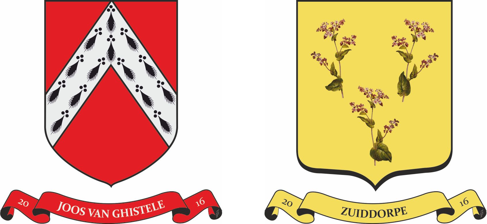 Het wapen van de familie van Ghistele komt al voor in de 12de eeuw toen een zekere Ghistelbert bij Oosteinde (B) een nederzetting bouwde dat ‘Gistel’ werd genoemd. De keper/chevron in het wapen symboliseert ‘Steun en Kracht’ en de hermelijnen staartjes, die later in de keper/chevron zijn toegevoegd, verwijzen naar een zeer hoge ‘Adellijke Status’. In het wapen van Zuiddorpe staan drie boekweitplantjes. Algemeen wordt aangenomen dat Mher Joos op zijn terugreis, nabij de Bosporus, enkele van deze zaadjes heeft verstopt in zijn dagboek of in zijn holle pelgrimsstaf, omdat uitvoer toen streng verboden was. Hij heeft deze zaadjes laten telen rond zijn kasteel in Zuiddorpe om er brood voor de armen van te laten maken. Het telen van zaadjes zal ongetwijfeld ook nog wel ter discussie hebben gestaan met de geestelijken uit die tijd, mede omdat het uit heidense landen kwam. Maar Mher Joos zou Mher Joos niet zijn om er alles aan te doen om zijn doel te bereiken, nietwaar!!!